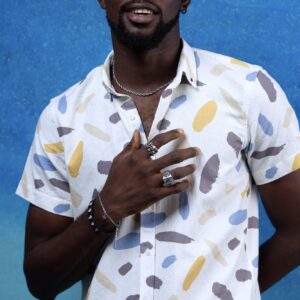₦34,999.00100% premium linen Short sleeves, relaxed resort collar Multi-color wave embroidery (blue, mustard, brown) Lightweight and breathable texture Tailored fit for comfort and ease Model… -